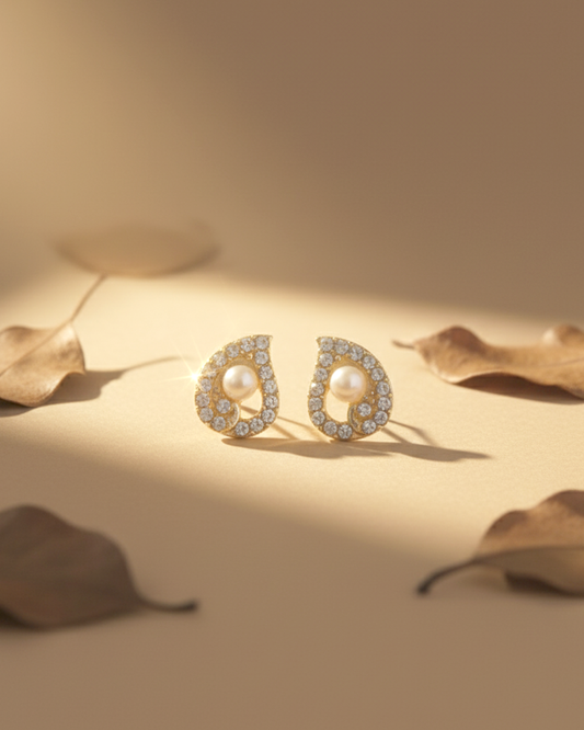 Diamond Leaf Korean Style Pave Crystal and Pearl Drop Earrings